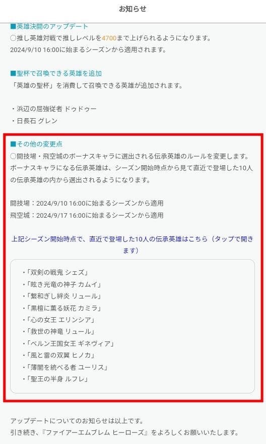 アップデート 伝承英雄のルール変更(直近10名)【FEH/FEヒーローズ】 2024年09月01日 カテゴリ:FEH最新情報 2024年08月 伝承シェズの実装(最新)2023年02月 伝承ルフレの実装(最古) (コメント欄について)※コメント欄にはIDが表示されます。(PC版のみ)※重要なネタバレ・公序良俗に反するコメントはお控えください。またそういうコメントには反応しない様お願いいたします。※コメント欄にNGワードを設定しています。NGワードを含むコメントは投稿できない、または後で非公開とさせていただきます。ご了承下さい。 タグ :#FEH#FEヒーローズ#アップデート 「FEH」カテゴリの最新記事 「最新情報」カテゴリの最新記事 コメント コメント一覧 1. 名無しさん 2024年09月03日 17:07 ID:sM1rFhQM0 久しぶりに来たら再開してたのね、長らくお世話になってたから嬉しいわ 新管理人さん頑張ってー コメントする コメントフォーム 名前 コメント 記事の評価 リセット リセット 顔 星 情報を記憶 コメントを投稿する